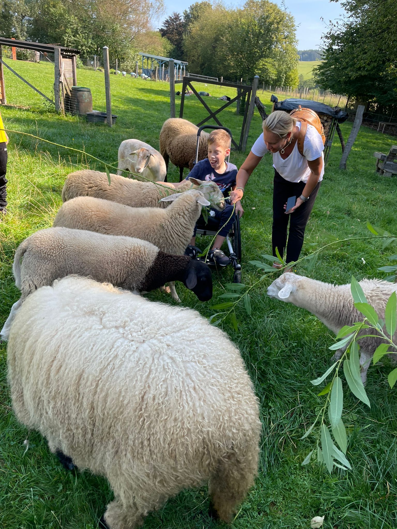 Ca. 15.000qm Nutzungsfläche. Mögliche Einteilung in 5 Portionsweiden, um Tieren während der Besuchszeit deutliche Ruhebereiche zu sichern. Die Tierbegleitung findet ausschließlich in Begleitung der Hofbesitzer oder eingewiesener Mitarbeiter statt, die Besucher dürfen die Tiere nicht füttern. Der Tierkontakt findet eigenaktiv durch die Tiere selbst statt. Wenn Tiere nicht selbst zu den Besuchern kommen, werden sie in Ruhe gelassen und dies im Rahmen der erläuterten Verhaltensbeobachtung aufgegriffen. Im Anschluss an die Tierzeit können die Tiere nur noch von außerhalb beobachtet werden und nehmen an den anderen Angeboten (s. Konzept) teil.